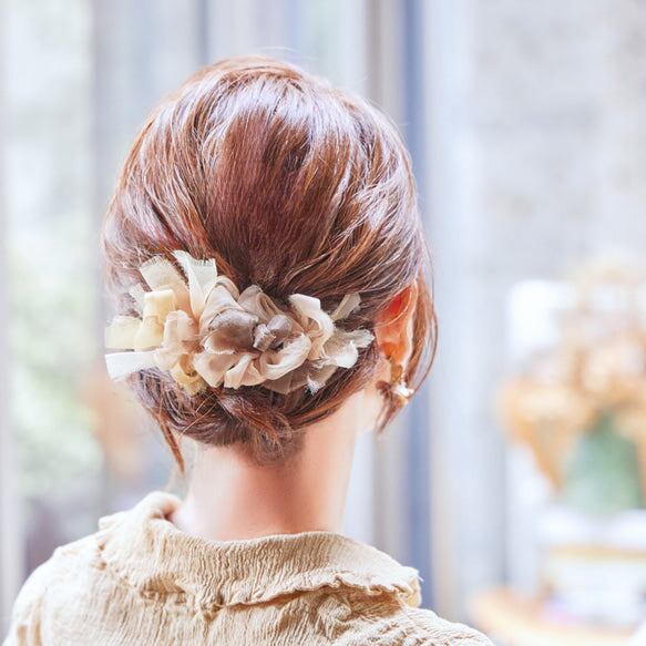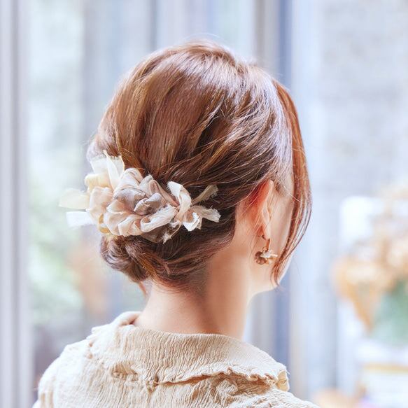 ふわんとした咲き編みは、オーガンジーから生まれます。 オーガンジーとは、薄くて軽く、ハリのある風合いの固い手織りの平織物のことを言います。 光を通すので、独特の柔らな雰囲気を持ちつつ上品な透け感が透明感を演出し、独特の光沢感と弾力性が特徴です。 あらゆる生地を裂いた結果、chikoでは強度が強く品質が安定しているポリエステルオーガンジーを使用しています。 ヘアアレンジ