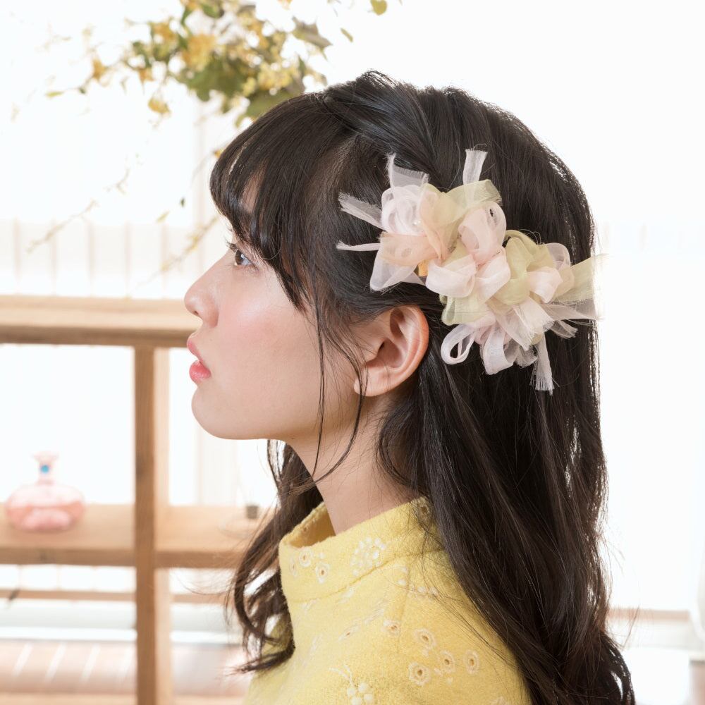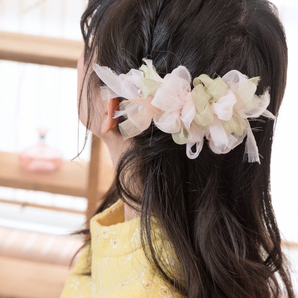やさしいジャパニーズカラーは、季節を問わず日本の女性を彩ります。どこまでもやさしいパステルの掛け合わせで表情もやわらかくなります! カラーペールピンク×ペールグリーン、 ポイントカラーはゴールドベージュサイズ 金具全体:80mm×10mm 金具挟み幅 -バレッタ:60mm -クリップ:70mm ふわふわ部分11~12cm ぴょんぴょんしたおリボンも含めた最大部分17~18cm素材オーガンジー(ポリエステル)、ヨーロピアンビーズ(ステンレススチール)、プレート(真鍮) 素材のこだわり