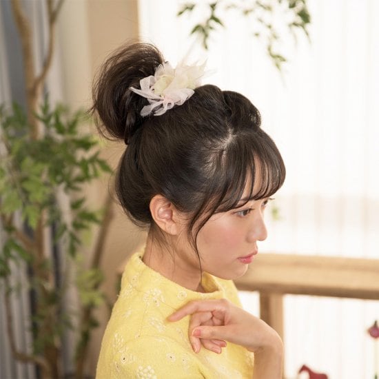 ふわんとした咲き編みは、オーガンジーから生まれます。 オーガンジーとは、薄くて軽く、ハリのある風合いの固い手織りの平織物のことを言います。 光を通すので、独特の柔らな雰囲気を持ちつつ上品な透け感が透明感を演出し、独特の光沢感と弾力性が特徴です。 あらゆる生地を裂いた結果、chikoでは強度が強く品質が安定しているポリエステルオーガンジーを使用しています。 ヘアアレンジ