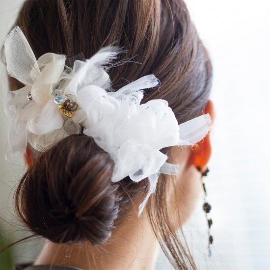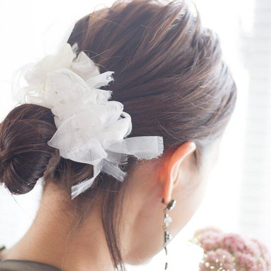 ふわんとした咲き編みは、オーガンジーから生まれます。 オーガンジーとは、薄くて軽く、ハリのある風合いの固い手織りの平織物のことを言います。 光を通すので、独特の柔らな雰囲気を持ちつつ上品な透け感が透明感を演出し、独特の光沢感と弾力性が特徴です。 あらゆる生地を裂いた結果、chikoでは強度が強く品質が安定しているポリエステルオーガンジーを使用しています。 ヘアアレンジ