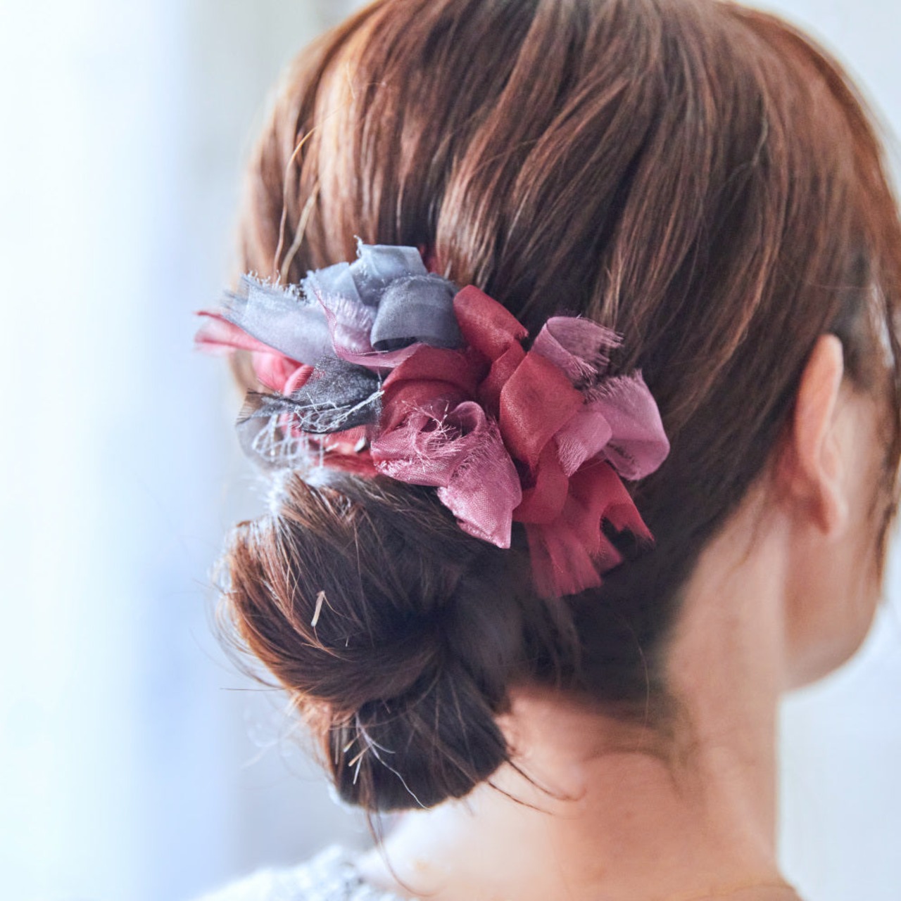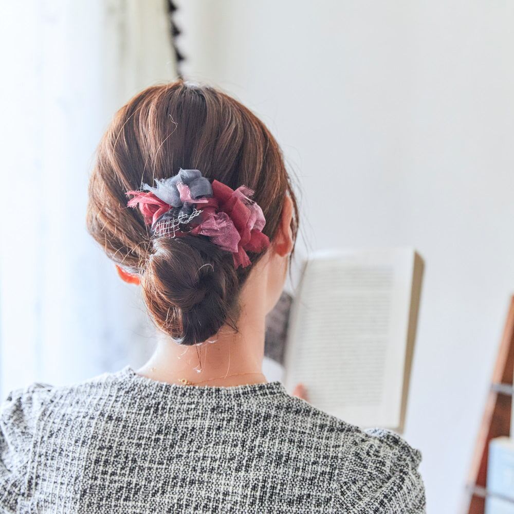 ふわんとした咲き編みは、オーガンジーから生まれます。 オーガンジーとは、薄くて軽く、ハリのある風合いの固い手織りの平織物のことを言います。 光を通すので、独特の柔らな雰囲気を持ちつつ上品な透け感が透明感を演出し、独特の光沢感と弾力性が特徴です。 あらゆる生地を裂いた結果、chikoでは強度が強く品質が安定しているポリエステルオーガンジーを使用しています。ヘアアレンジ