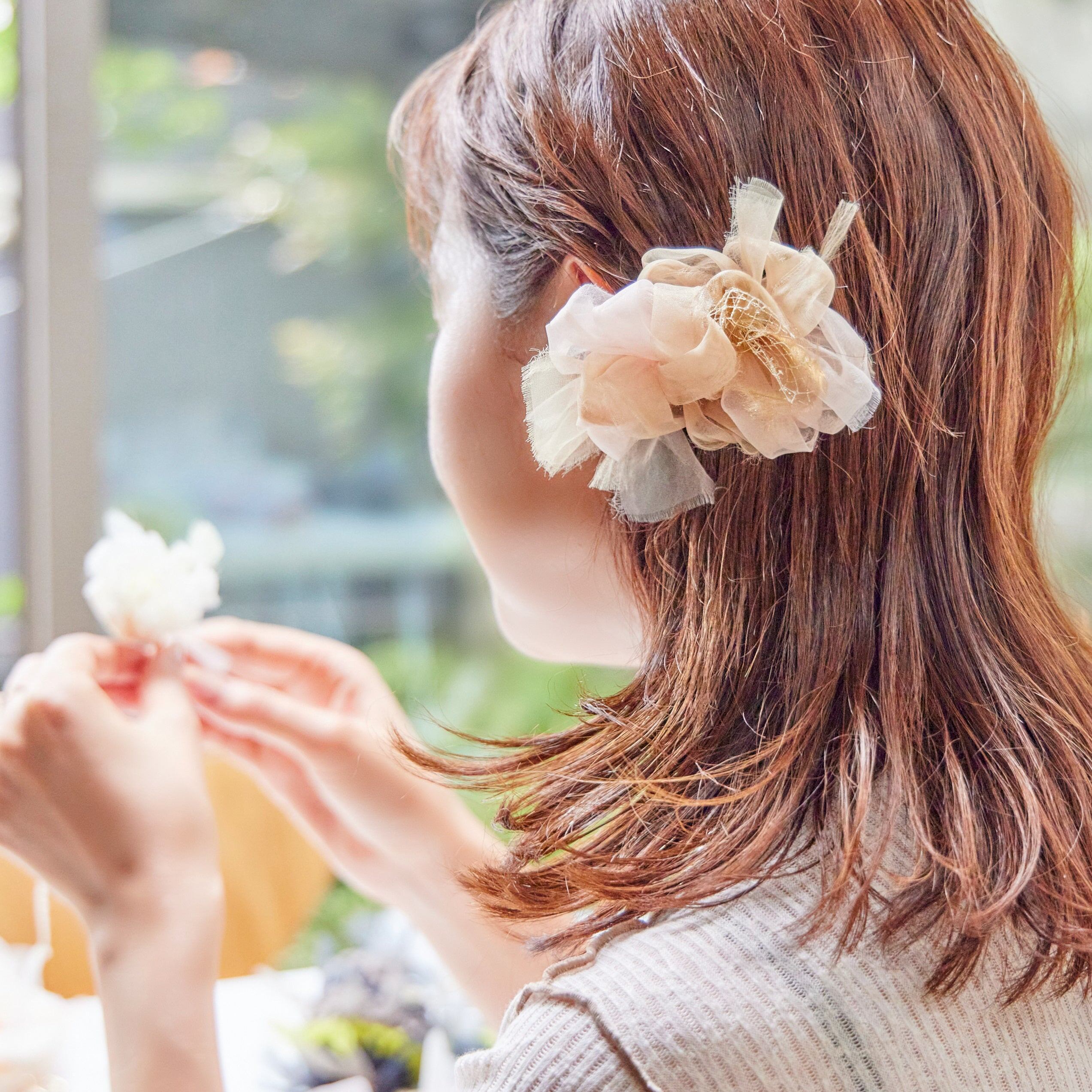 ふわんとした咲き編みは、オーガンジーから生まれます。 オーガンジーとは、薄くて軽く、ハリのある風合いの固い手織りの平織物のことを言います。 光を通すので、独特の柔らな雰囲気を持ちつつ上品な透け感が透明感を演出し、独特の光沢感と弾力性が特徴です。 あらゆる生地を裂いた結果、chikoでは強度が強く品質が安定しているポリエステルオーガンジーを使用しています。ヘアアレンジ