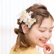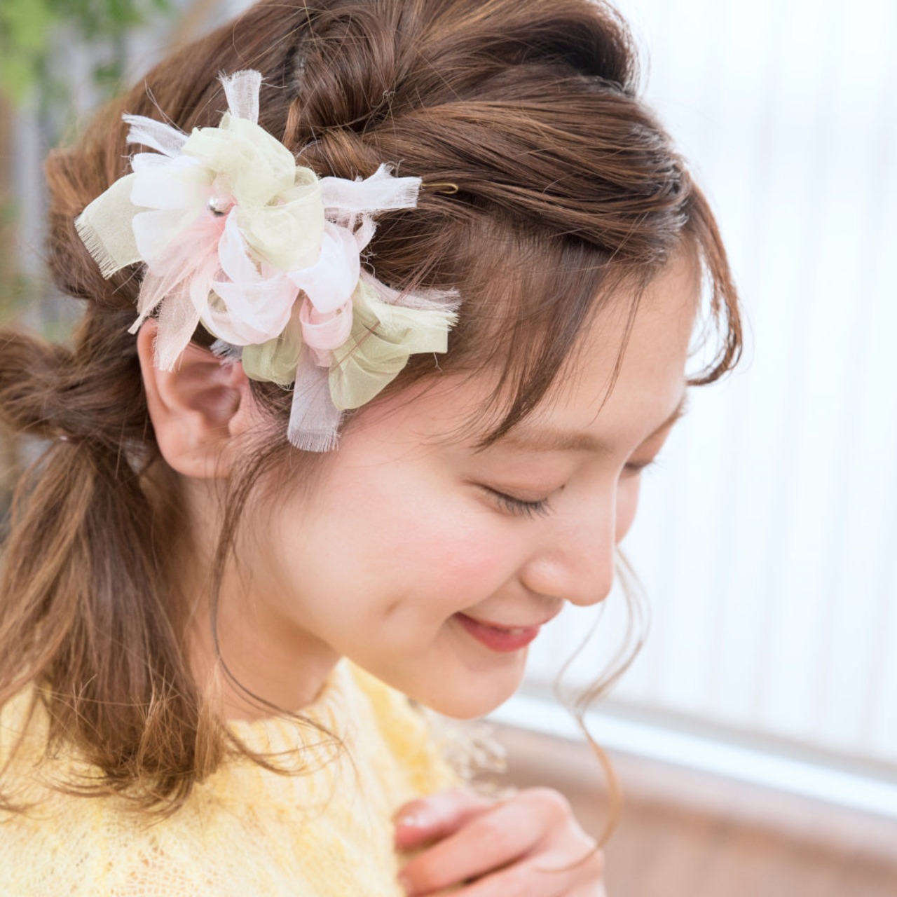ふわんとした咲き編みは、オーガンジーから生まれます。 オーガンジーとは、薄くて軽く、ハリのある風合いの固い手織りの平織物のことを言います。 光を通すので、独特の柔らな雰囲気を持ちつつ上品な透け感が透明感を演出し、独特の光沢感と弾力性が特徴です。 あらゆる生地を裂いた結果、chikoでは強度が強く品質が安定しているポリエステルオーガンジーを使用しています。 ヘアアレンジ