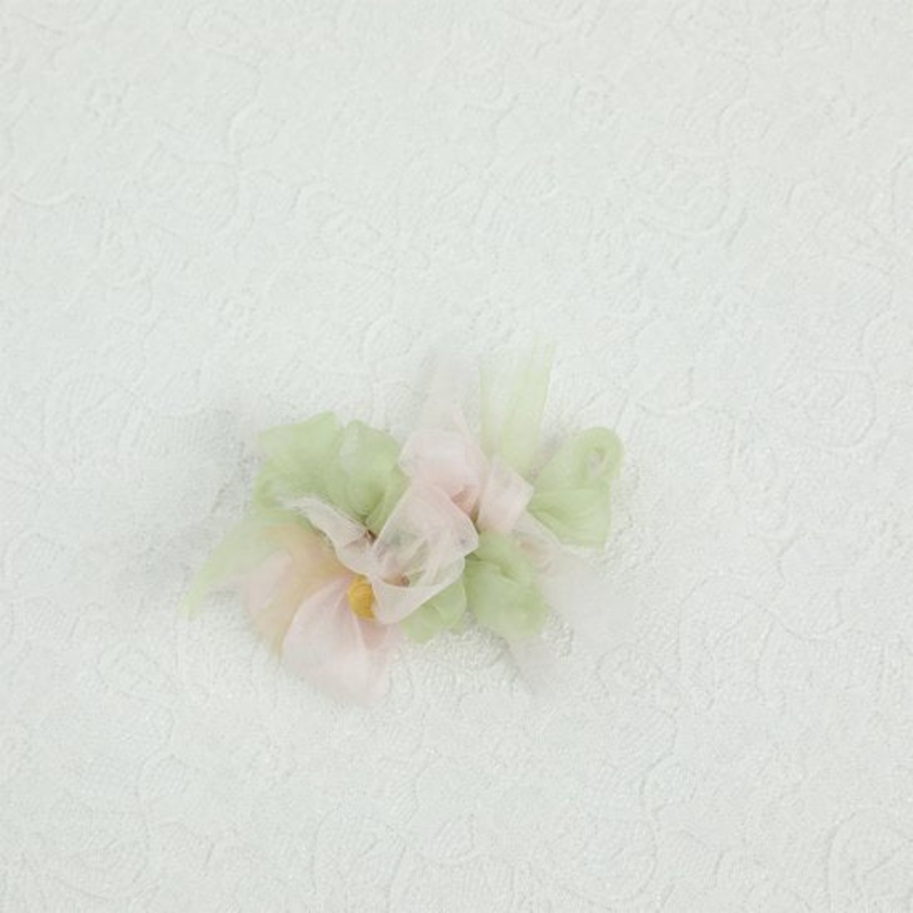 やさしいジャパニーズカラーは、季節を問わず日本の女性を彩ります。どこまでもやさしいパステルの掛け合わせで表情もやわらかくなります! カラー ペールピンク×ペールグリーン、 ポイントカラーはゴールドベージュサイズ 金具全体 -バレッタ:50mm×6mm -ヘアクリップ:50mm×10mm 金具挟み幅 -バレッタ:30mm -ヘアクリップ:40mm ふわふわ部分10cm ぴょんぴょんしたおリボンも含めた最大部分15cm素材オーガンジー(ポリエステル)、ヨーロピアンビーズ(ステンレススチール)、プレート(真鍮) 素材のこだわり