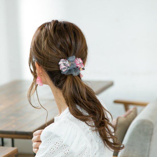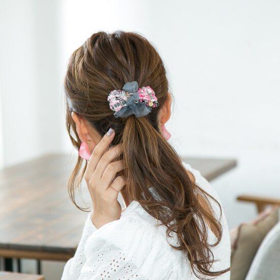 バレッタ、ヘアクリップ、ポニーフックから、スタイルに合わせた金具をお選びいただけます。楽しみいろいろ、Youtubeやインスタグラムでもスタイリングのご提案をしています!咲き編み商品の特徴