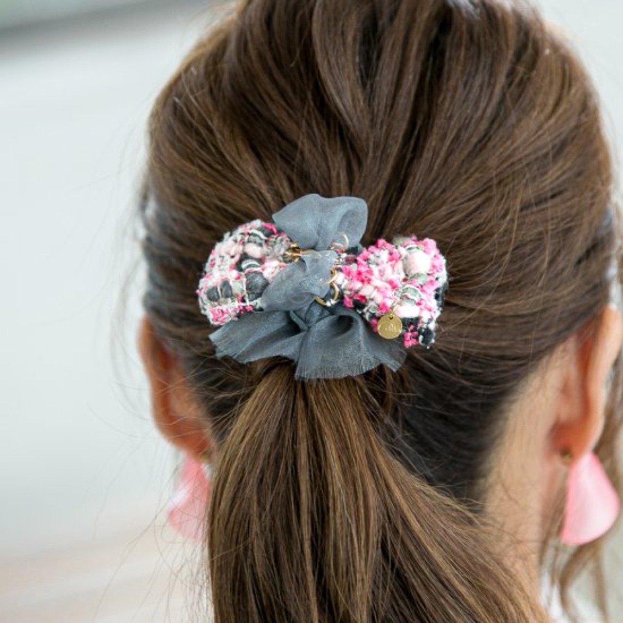 オーガンジーの幅、長さ、チェーンとのからみ、試行錯誤を重ねて納得の形に仕上げました。カラーツイード:ピンク、グレー、ブラックオーガンジー:グレーサイズ【バレッタ】金具全体:50mm×10mm、金具挟み幅:40mm【ヘアクリップ】バレッタ金具全体:50mm×6mm バレッタ金具挟み幅:30mm 【ポニーフック】リボン幅8cm、縦幅4.5cm、オーガンジーも含めた縦幅6.5cm、フック部分3.5cm程度素材オーガンジー(ポリエステル)、ツイード(ウール)、チェーン、プレート(真鍮)素材のこだわり