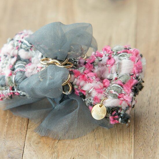 ツイードの上品なリボンにチェーンとオーガンジーを編みつけて、淑女の装い。ぐっと品格が増しますね!