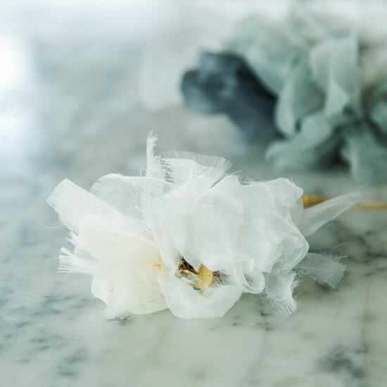 ふわんとした咲き編みは、オーガンジーから生まれます。 オーガンジーとは、薄くて軽く、ハリのある風合いの固い手織りの平織物のことを言います。 光を通すので、独特の柔らな雰囲気を持ちつつ上品な透け感が透明感を演出し、独特の光沢感と弾力性が特徴です。 あらゆる生地を裂いた結果、chikoでは強度が強く品質が安定しているポリエステルオーガンジーを使用しています。ヘアアレンジ